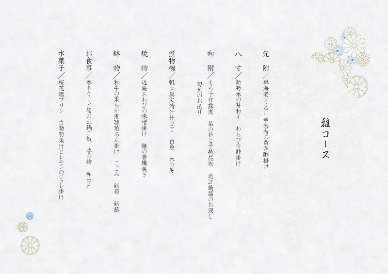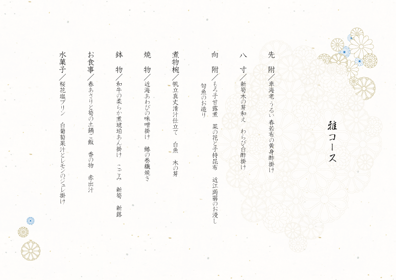伝統の菊紋をあしらった和モダンが特徴の洗練されたデザインの高級和食レストラン向けに想定されたお品書き