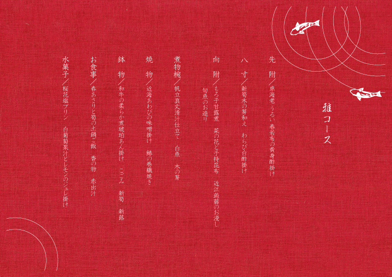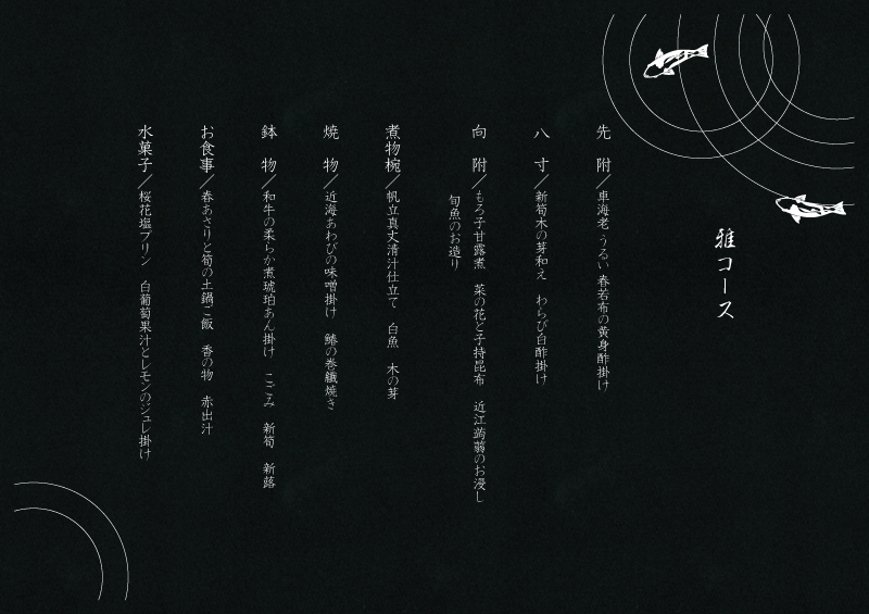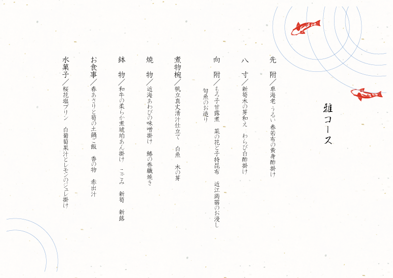 水の波紋と涼しげに泳ぐ鯉 が和の落ち着いた優しい印象の日本料理で使うのにぴったりのお品書き